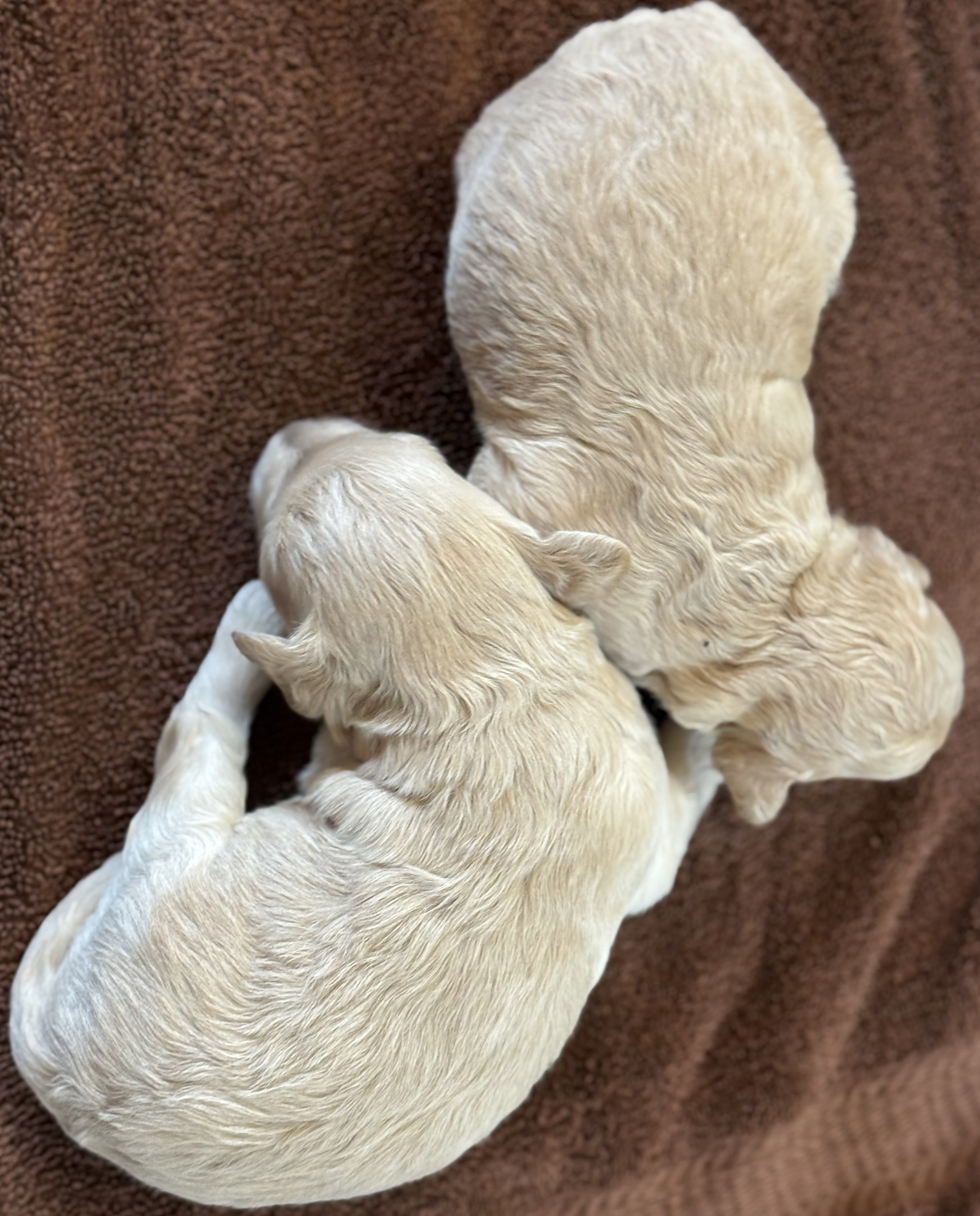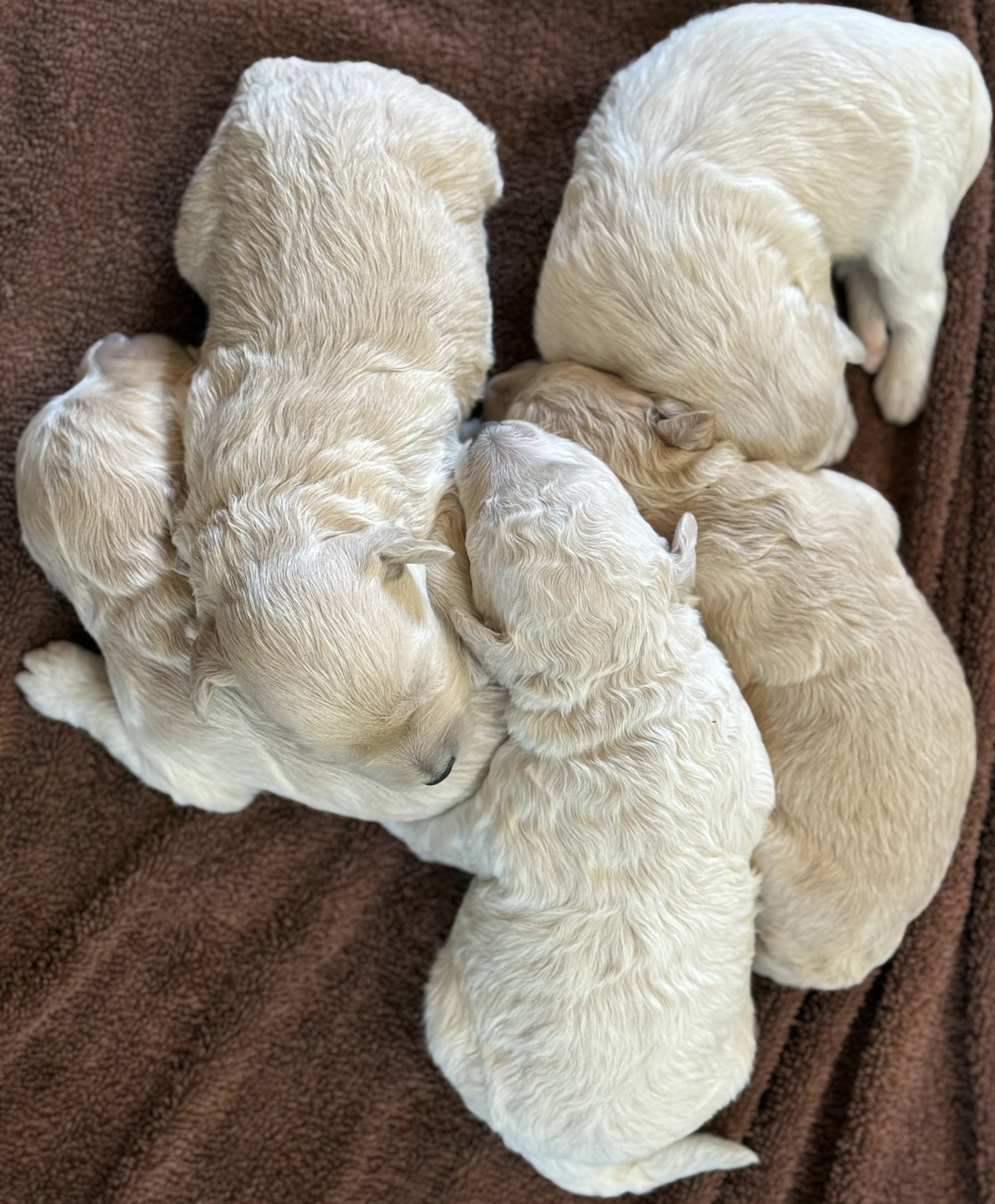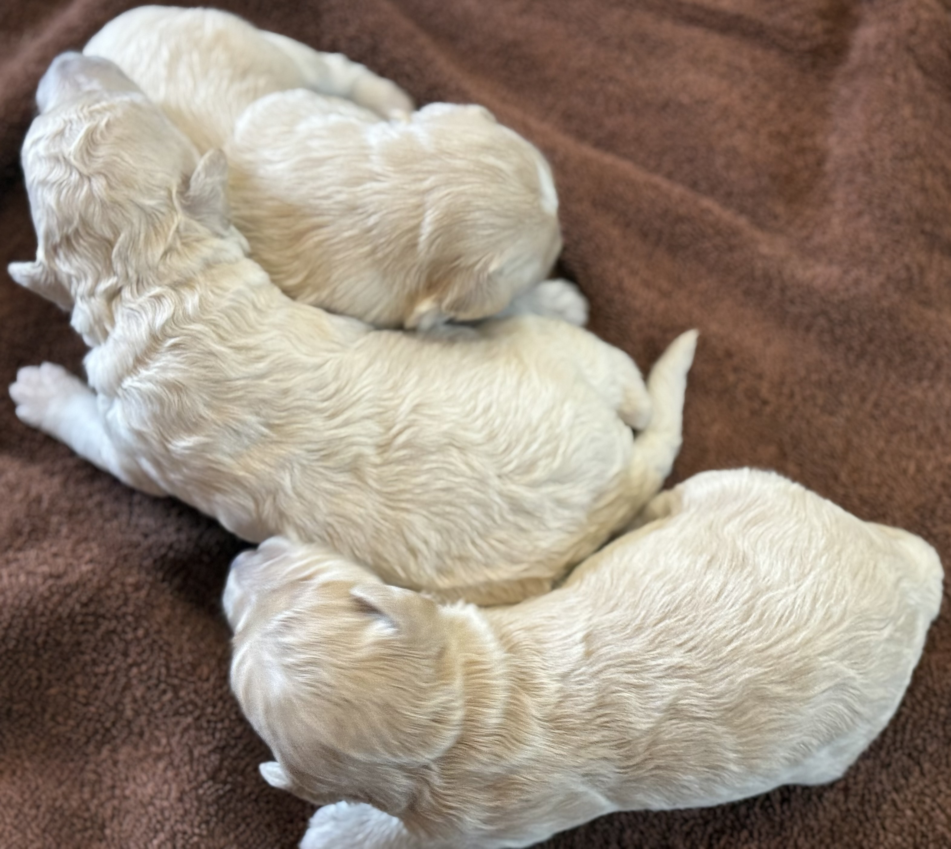 These puppies below are available to reserve now. They will be ready to go to homes in mid December 2025. 3 females and 2 males. F1B Miniature Golden Doodles. They will be in the 15-25 pound range when mature. Momma is Ford and Dad is Princeton.